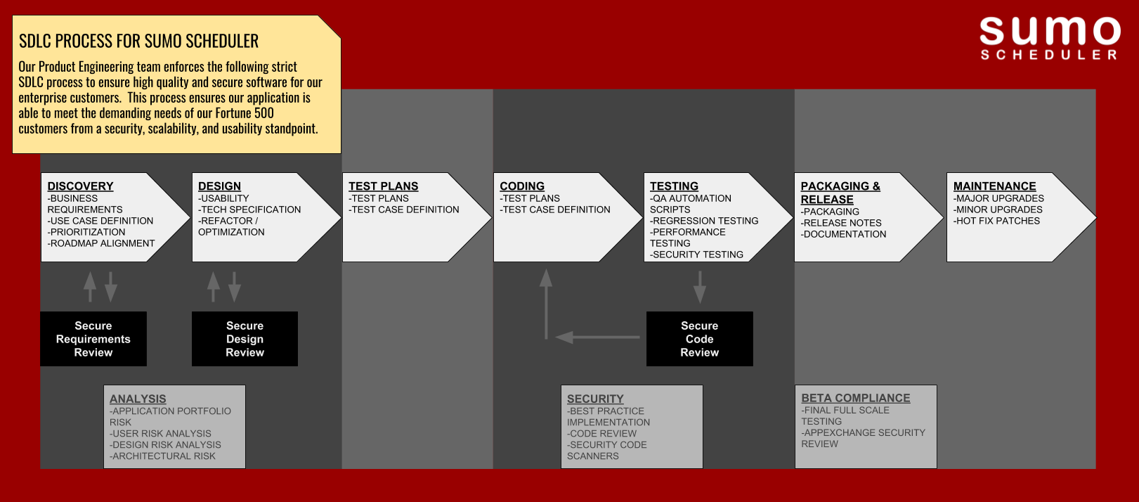 Our Product Engineering team enforces the following strict SDLC process to ensure high quality and secure software for our enterprise customers. This process ensures our application is able to meet the demanding needs of our Fortune 500 customers from a security, scalability, and usability standpoint.