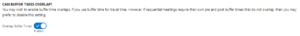 You may wish to enable Buffer Time Overlaps, if you use Buffer Time for Travel Time. However, if sequential meetings require their own pre and post buffer times that do not overlap, then you may prefer to disable this setting.