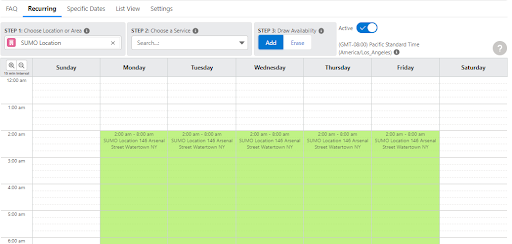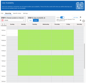 Mostly likely you will simply click on Recurring tab, choose the Location you work at, and draw in your availability to be Monday through Friday 8am to 5pm. You might choose to erase 12pm-1pm for your lunch break.