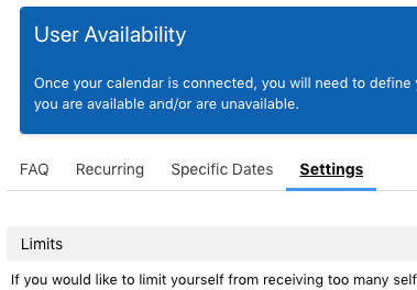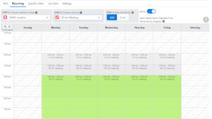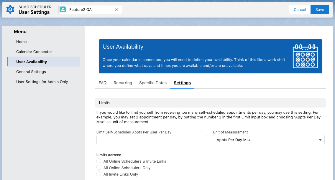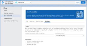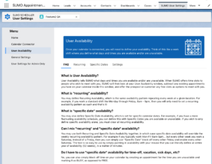 First of all, typically SUMO User’s set their availability to a window that matches their work shift, such as Monday – Friday, 8am – 5pm. However, there is nothing preventing a user (or Admin) from setting availability to a smaller window of time, to limit when customers can self-schedule appointments with them. You may use both the Recurring and Specific Dates capability to limit the days and time windows, when customers can self-schedule with you. For example, perhaps Jane only wants customers to self-schedule appointments with her in her mornings. She would go to SUMO User Settings > User Availability> and set her Recurring Availability to be Mon-Fri 8am-12pm, in which case customers would never be able to schedule an afternoon meeting with her.