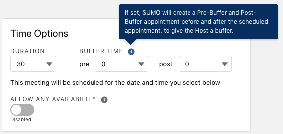 User Buffer Times: Each user may define their own pre and post buffer time to be applied to all appointments scheduled with SUMO.