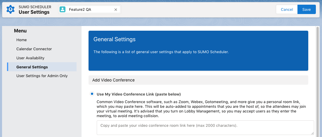 Common Video Conference software, such as Zoom, Webex, Gotomeeting, and more give you a personal room link, which you may paste into SUMO. Your personal link will be auto-added to appointments that you are the host of, so the attendees may join your virtual meeting. It’s advised that you turn on Lobby Management (aka Waiting Rooms), so you may accept users as they enter the meeting, to avoid meeting collision.