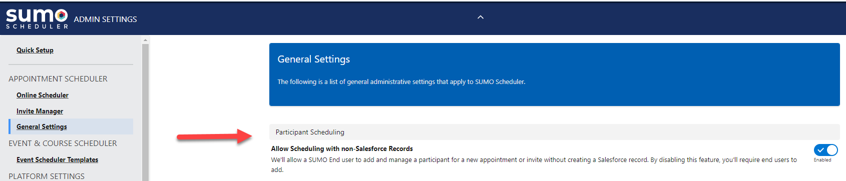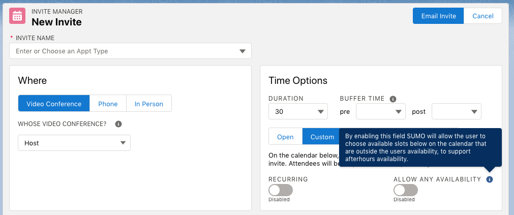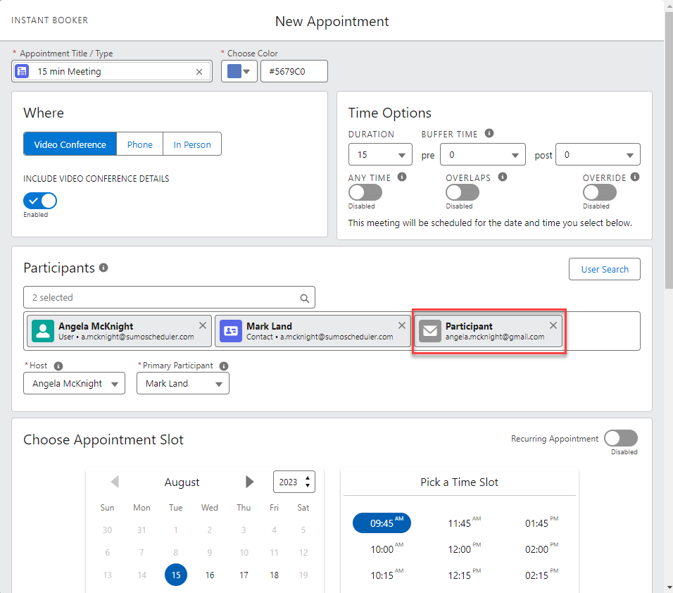 This setting will allow you to add a Participant to an appointment using just their email address. You will still need to have the SUMO User (Host) and a Primary Participant (Contact, Lead, or Person Account).