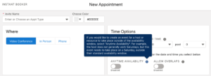 For example, perhaps you want to use the Instant Booker to schedule an appointment with a customer on a weekend, you may enable the Anytime feature, which will then allow you to choose a weekend time slot to book.