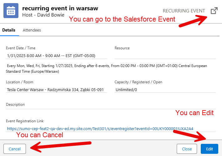 Once you have gone to the Salesforce event you can use the edit button on the page to edit the SUMO Event. Make sure that you have added the correct button to the page layout.